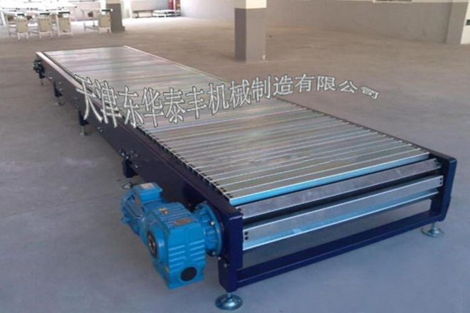 鏈板輸送機(jī)以標(biāo)準(zhǔn)鏈板為承載面,由馬達(dá)減速機(jī)為動(dòng)力傳動(dòng);我們可以通過多列鏈板并行,使鏈板輸送機(jī)做的很寬并形成差速,利用多列鏈板的速度差使多列輸送在無(wú)擠壓的情況下變?yōu)閱瘟休斔停瑥亩鴿M足飲料貼標(biāo)、灌裝、清洗等設(shè)備的單列輸送的要求,我們可以將兩條鏈板輸送機(jī)的頭尾部做成重疊式的混合鏈?zhǔn)沟闷浚ü蓿w處于動(dòng)態(tài)過度狀態(tài),使輸送線上不滯留物料,可以滿足空瓶以及實(shí)瓶壓力和無(wú)壓力輸送。